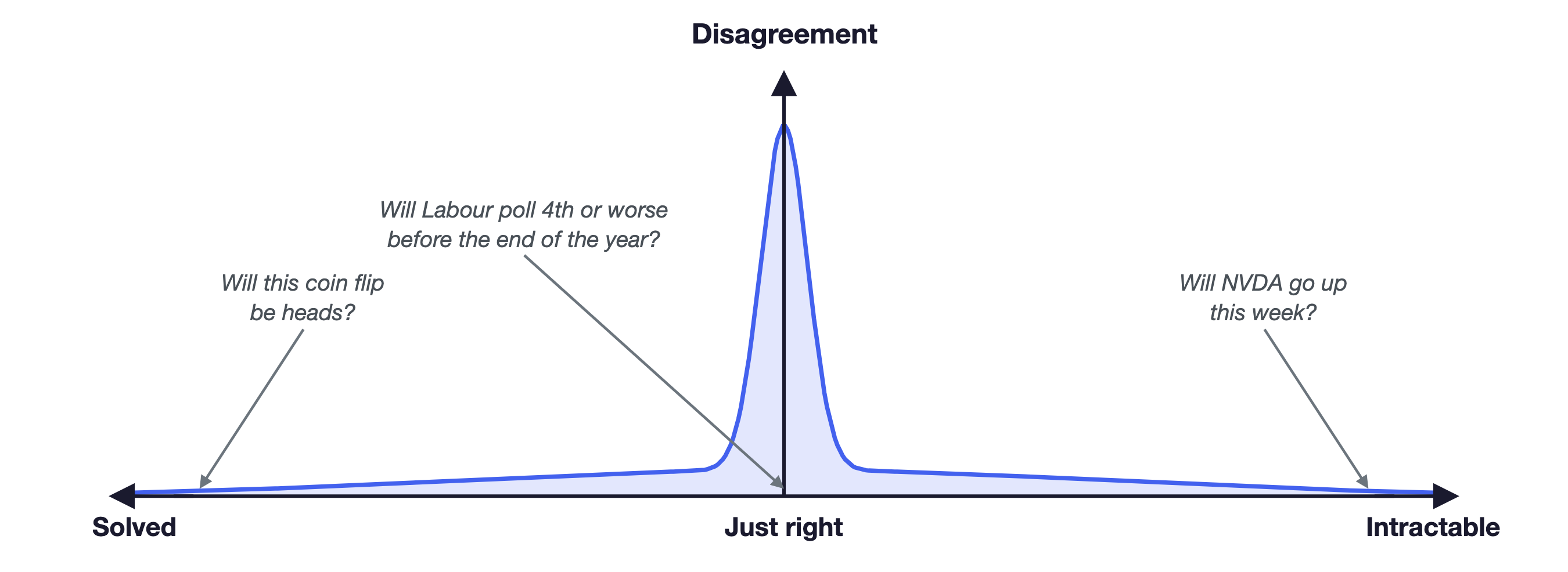 Unfortunately, most tournament questions do not probe these differences. Forecasters agree on both solved questions, where all that remains is the irreducible aleatoric uncertainty, and questions where no system has been able to make relative progress in reducing their epistemic uncertainty. Between these is the Goldilocks zone where there is some variation in the degree of understanding.